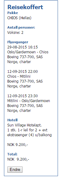 Det er charter fly til Chios fra Oslo via en reisebrå som heter https://www.lilleput.no/ . jeg har pratet med dem og fikk ca. pris som 3500 kr for kun t/r fra oslo . Ellers man kan jo velge pakke tur med dem som fly+overnatting som koster 9200 kr for 2 ukers opphold for 2 voksne. Se nedenfor :
