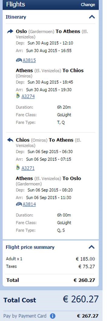 Ellers kan man ta aegeanair (https://en.aegeanair.com/e-services/e-ticket/) fra oslo via Athen til Chios som koster ca 2200 kr per pers t/r. Se nednefor:
